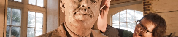 Image of Hazel Reeves sculpting the Sir Nigel Gresley statue (photo by Roger Bamber)